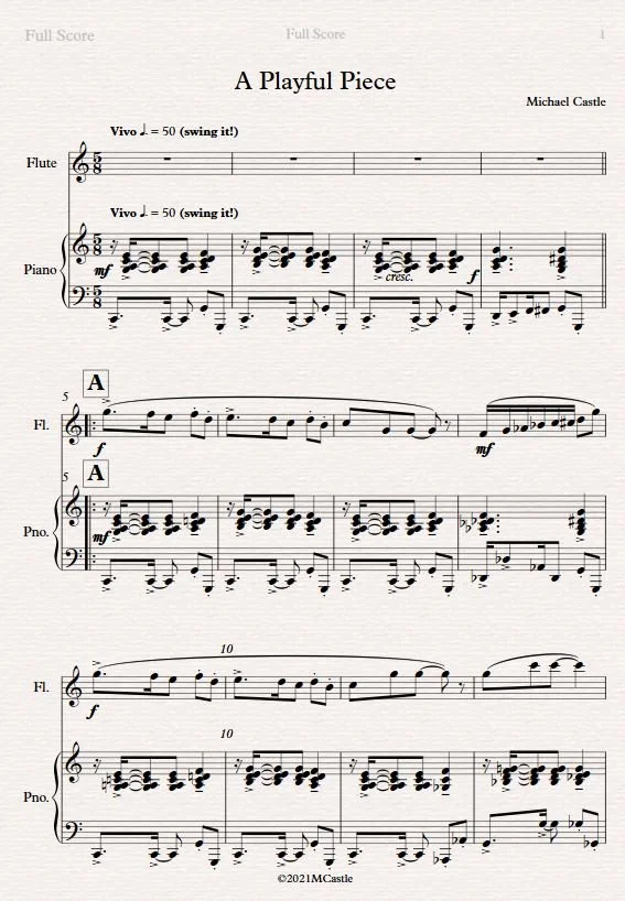 I have our scatty dog ‘Brig’ to blame for this piece that came to me in a flash on Dunster Beach, where I walked him, mostly at Dawn, every day. Once off the lead he would disappear like a cowboy (cowdog?) in a cloud of dust/sand and I vainly tried to keep up … failed every time. His constant dashing around got the idea of a 5/8 time (123-45) with a definite ‘swing’ to it….