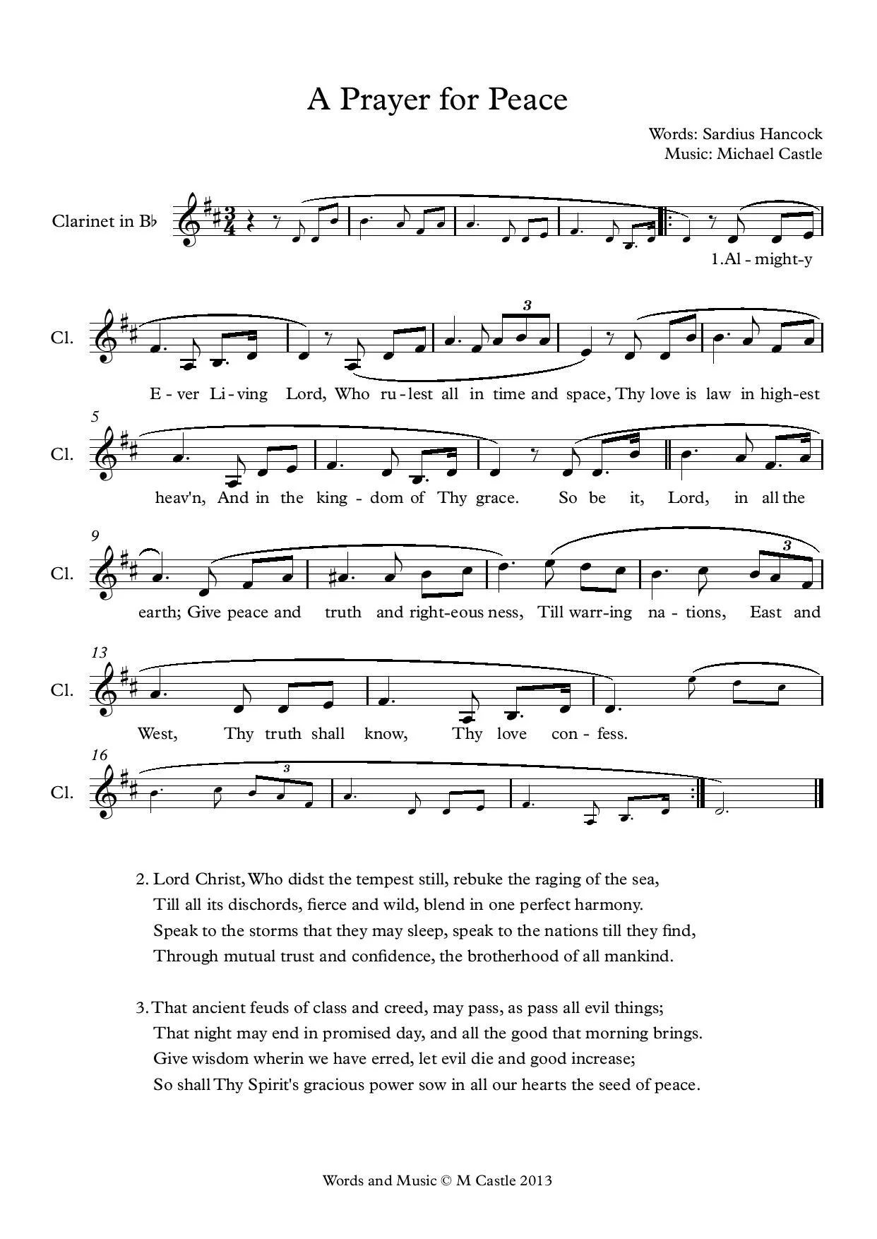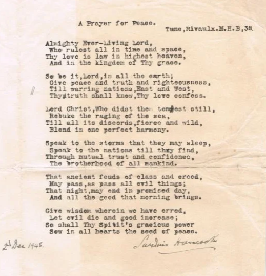 When Ralph and Wilf were killed in France, Sardius paid to have a stained glass window installed in their memory in Somers Park Methodist Church in Malvern. When I was clearing my late mum’s house, I came across some papers from Sardius, one of which was a poem he wrote in 1930 called ‘A Prayer for Peace.’ Reading it, you realise it could have been written yesterday for today’s world. I was so affected by the poem that I needed to set it to music.